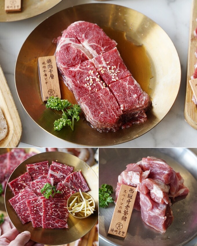 肉片超推薦這個長長超大片的「黑牛羽下」,油花還不錯,烤起來很嫩很甜,當天續了好幾盤~油花跟牛肉一樣美的「雪藏伊比利豬」,咬下去又嫩又脆口,豐腴油脂吃起來肉香四溢。