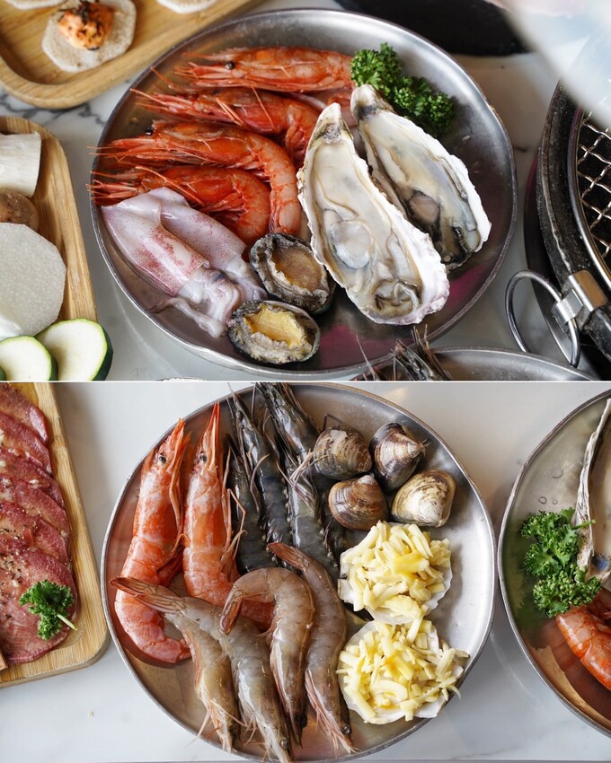 「燒肉吉室」另一個重頭戲就是海鮮種類超豐盛!手掌大「巨大生蠔」,蠔肉飽滿又鮮甜,不只生蠔大顆,連蛤蜊也很大顆!這「現撈大蛤」真的是顆顆飽滿又鮮甜。