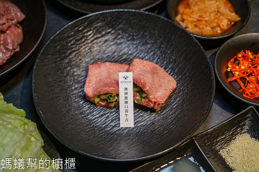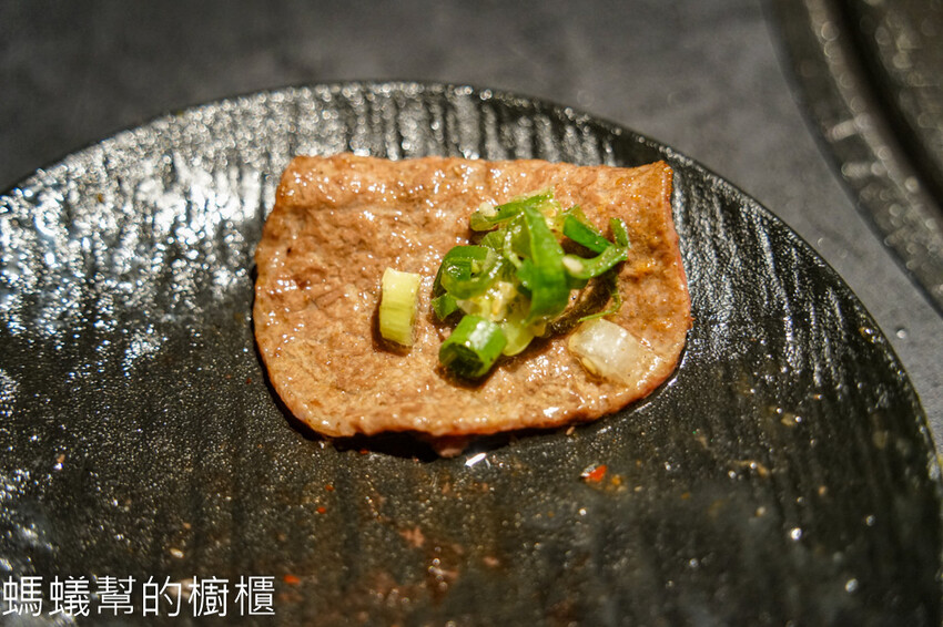 服務人員建議可先吃五分熟後吃七分熟度,先將牛舌兩面烤至金黃,剪開後外焦裡嫩,但又有牛舌本身的脆口感,搭配蔥鹽醬很對味,後再將部分牛舌燒烤到七分熟,吃起來更脆口。