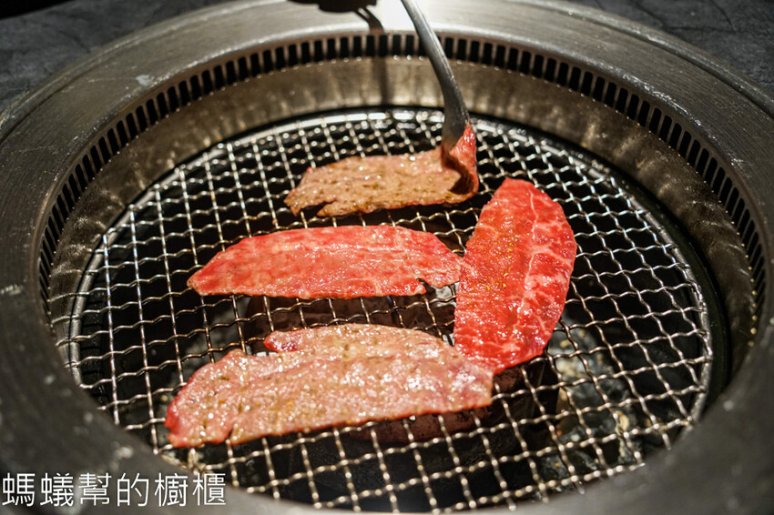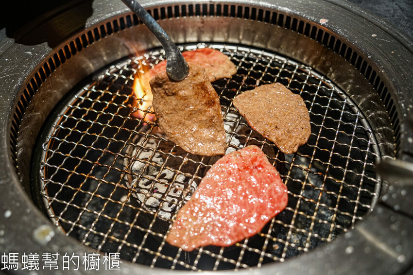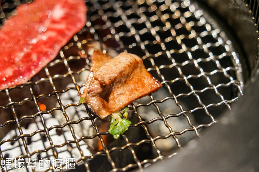 這盤嬌貴的A5和牛霜降,我們也特別小心翼翼燒烤著,大約6~7分熟,建議先吃和牛的原味,不沾任何調味料,入口肉質除了細嫩,還有很明顯的奶油油脂風味,接著我則是搭配蔥鹽醬一起入口,又是另一種不同口味。