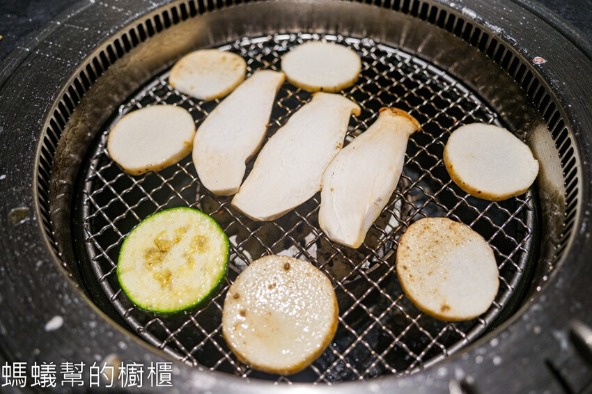 吃肉也要搭配蔬菜均衡一下,杏鮑菇、日本山藥、櫛瓜片。特別是這日本山藥燒烤後,脆口帶點山藥黏性,口感很特別。