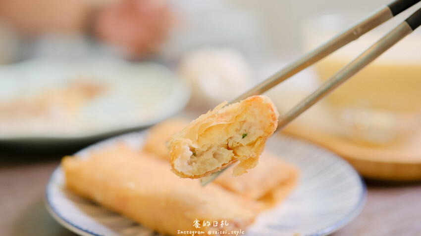 那就是這道腐皮蝦捲,外面有炸到酥脆到不行的腐皮不說,內餡的蝦漿也是完全的好吃,再油炸的過程中腐皮也是吸滿了蝦漿的美味,一口吃下真的是覺得——太美好了!