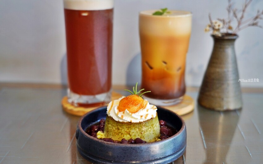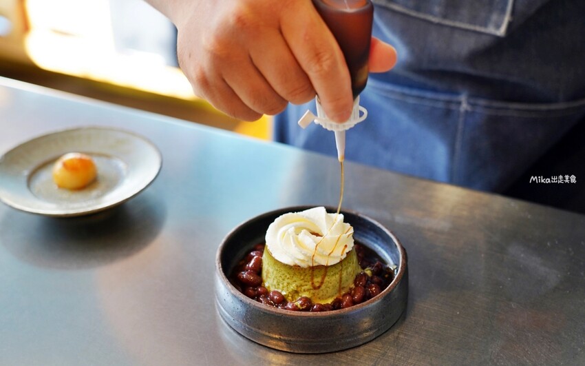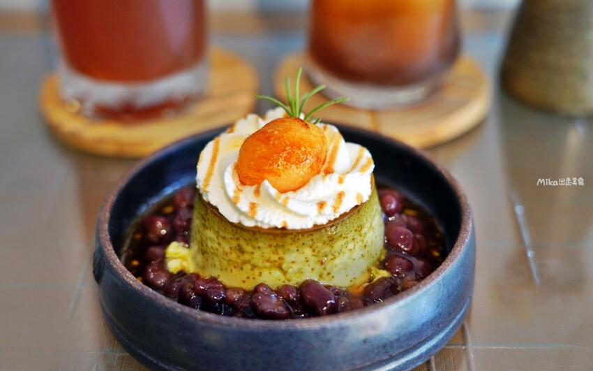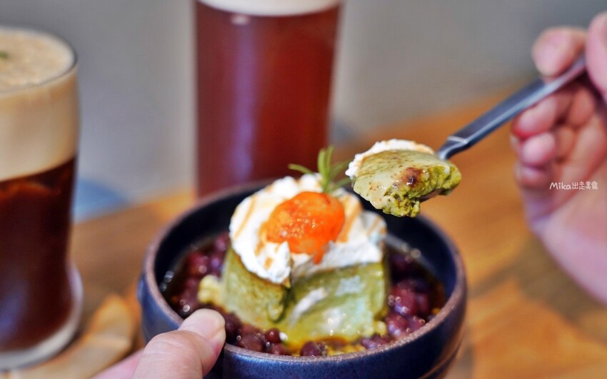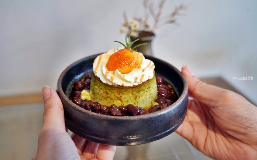 抹茶布丁像一座小山,上面有鮮奶油、蜜紅豆,旁邊搭配炙燒白玉,最後淋上黑糖醬,整個造型和味道都充滿驚喜。