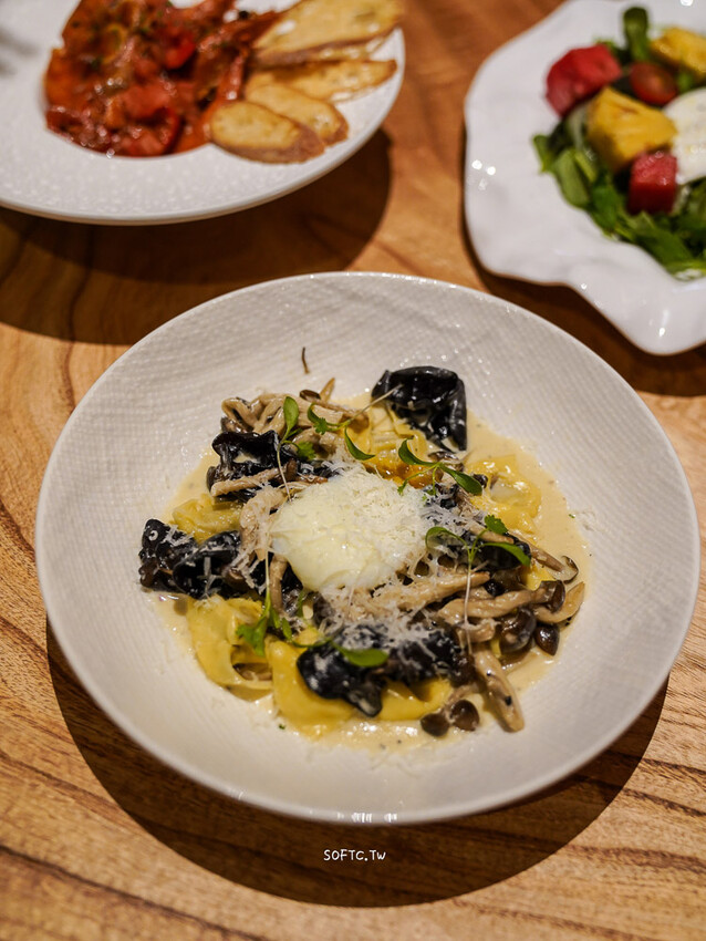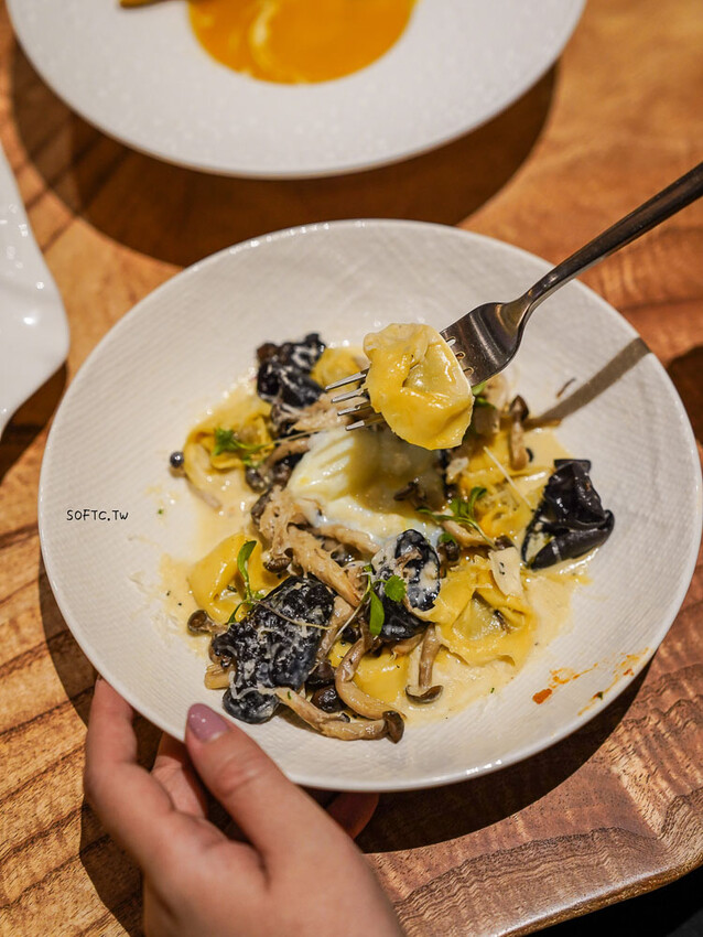 這道肚臍餃內餡法國牛肝菌和杜蘭小麥製成,蕈菇香氣撲鼻誘人,溫泉蛋咕溜滑順,餃類飽滿有Q度,整體清爽,黑木耳穿梭其中爽脆豐富滋味。
