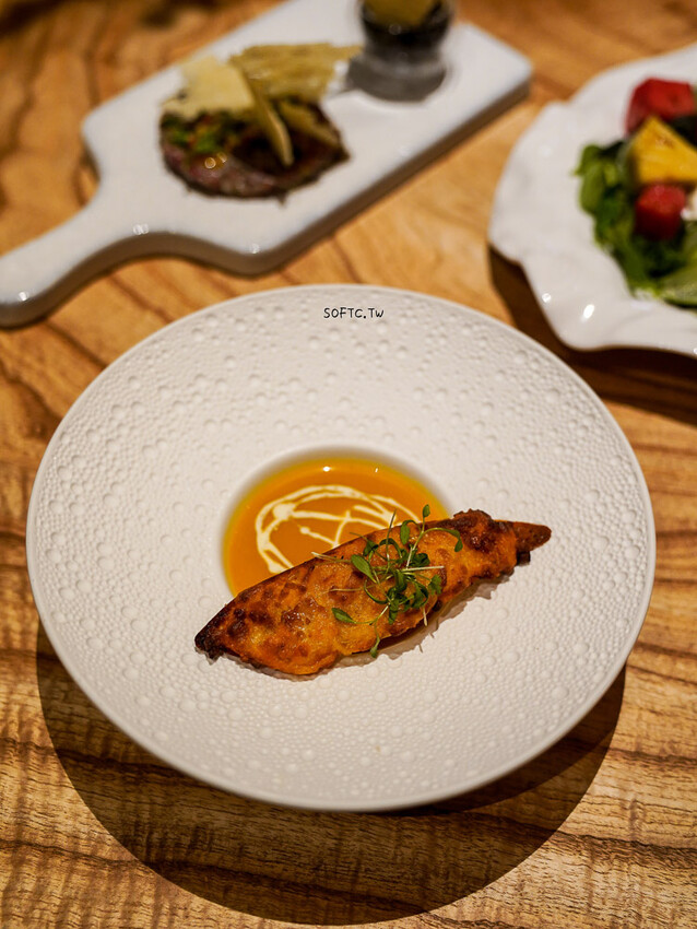如詩選用雲林安格斯溫體黑牛,製成生牛肉塔塔,牛肉新鮮柔嫩滿溢鮮甜,搭配如詩特製醬料增添層次感,裡頭還有熟成蛋黃,和上方起司脆片,單吃潤口滑順,不腥溫和,起司遇熱化在口中,融入牛肉後濃而不膩,十分開胃。