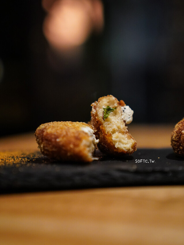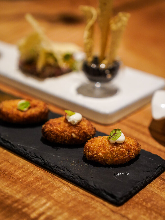 這個蟹肉球就是西班牙傳統可樂餅,內餡是白醬醃過的蟹肉,上面搭配酸酸甜甜檸檬優格醬,一咬下去細綿柔滑瞬間在口中散開蟹肉甘美和奶香四溢,外層金黃酥脆,不愧是西班牙招牌菜色之一。