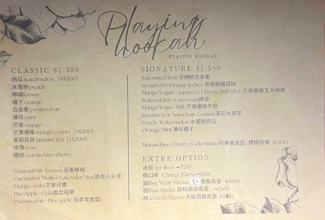 Playing Lounge Bar提供多款水煙,並有內含雪茄煙草的水煙,不抽煙的朋友也可以享受吞雲吐露的快樂,P.S.真的好快樂呀!店家還提供吹泡泡水,超有樂趣!