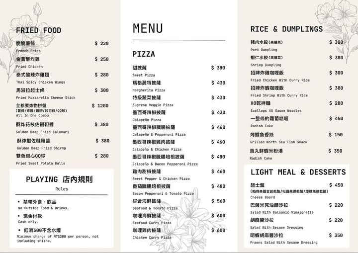Playing Lounge Bar提供很多美食料理,飲品也很多,最推的是水煙啦!