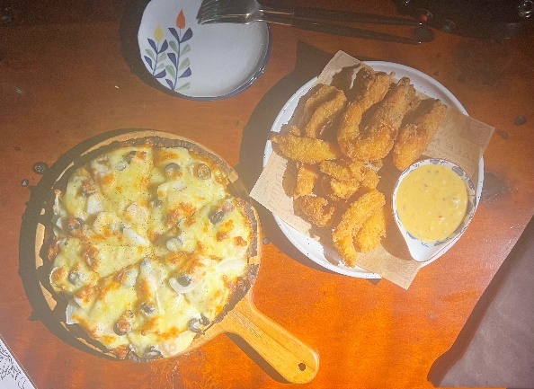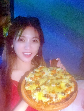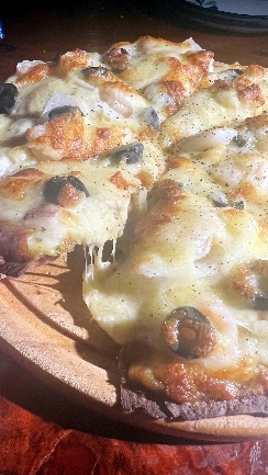 少見的咖哩口味披薩,真的是香氣撲鼻,讓人胃口大開!厚實的起士,牽絲的軟Q口感,真的是愛了愛了!