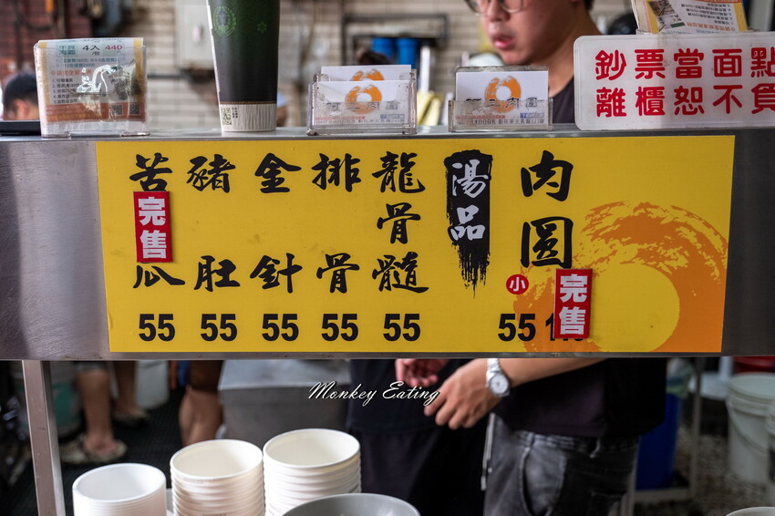品項也很簡單,就賣肉圓跟湯。有包干貝的大肉圓,一顆要價破百都賣光光了無緣吃到。這次先吃小肉圓吧~湯品每碗都55元,龍骨髓算是招牌,外縣市來的朋友推薦可以點。