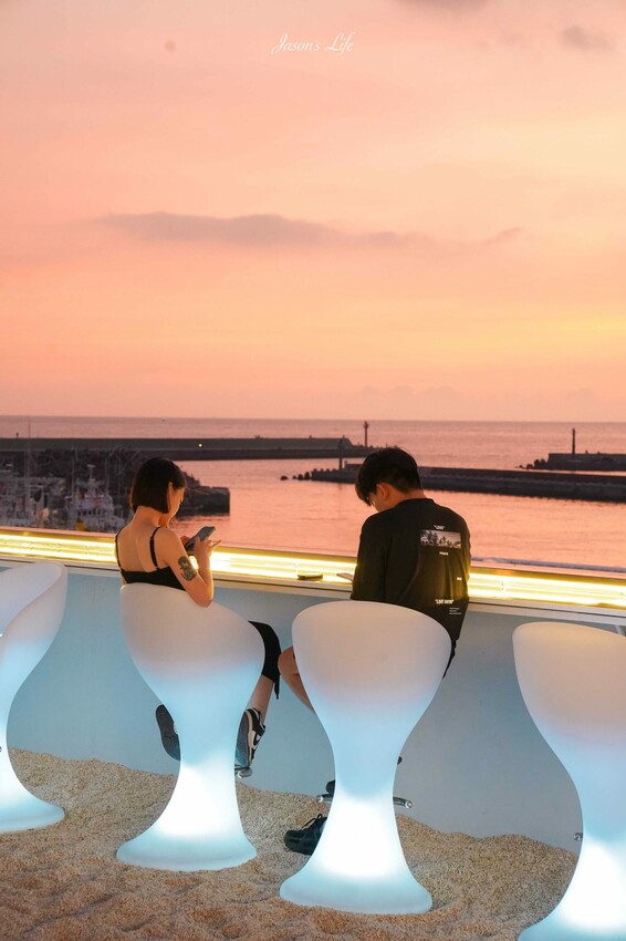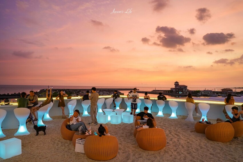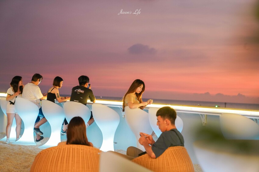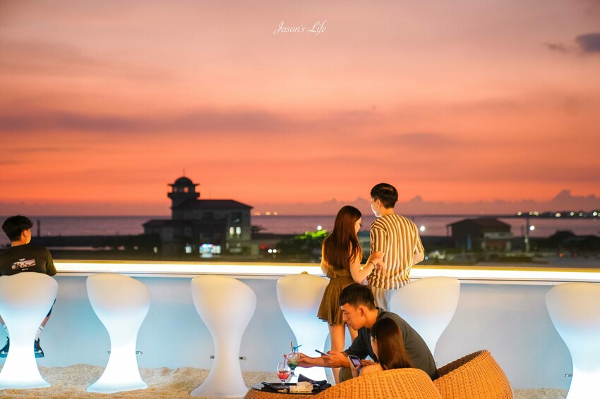現場放著熱鬧的音樂,讓人沉醉在被夕陽染紅的海面及天空