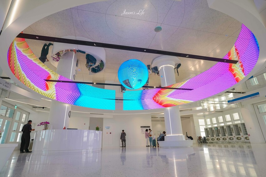 大廳的中間,設計了一個環型的投影設施,播放著一些有關地球海洋的畫面