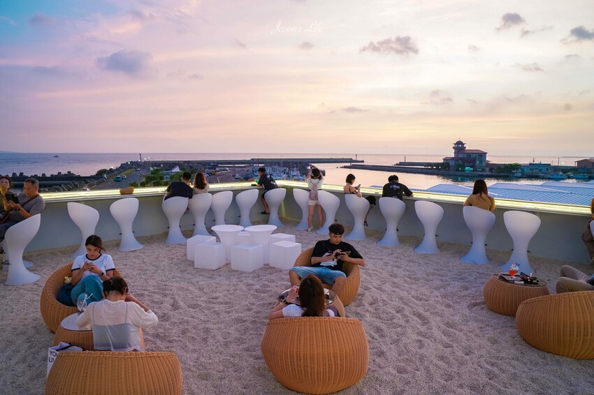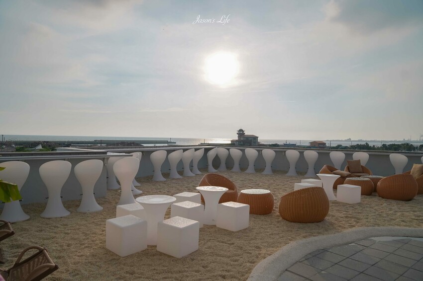屋頂把沙子運上來,搭配身後的海景,營造出一種很chill的氛圍