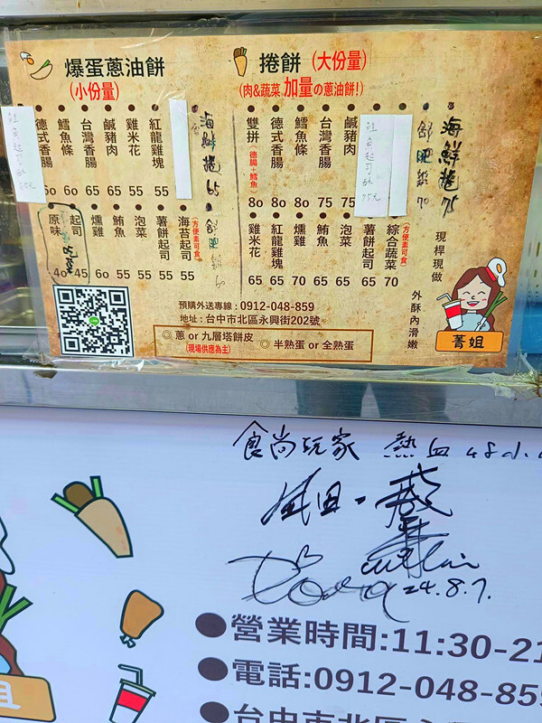 他們的蔥油餅有大小尺寸,主要差別是在份量的大小,大的捲餅$65~80,小的炸蛋蔥油餅$40~65,客人可依自己的食量來選,不過我通常選大份量的捲餅,比較能吃到更多蔬菜。攤位前面還看得到食尚玩家主持人的簽名,果然好攤位很快就能被發掘!