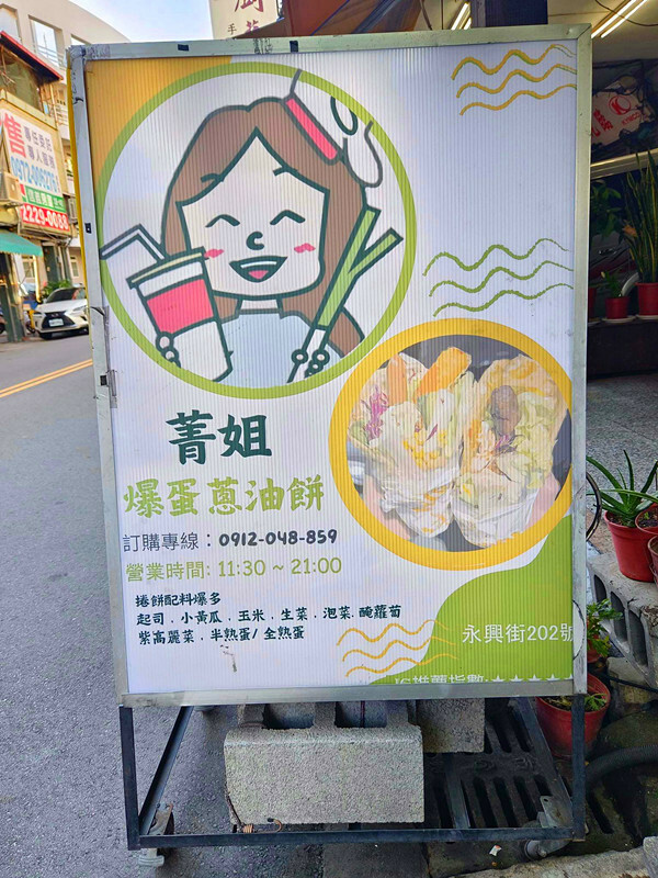 菁姐蔥油餅的燈箱立牌就矗立在店門口,在人來人往的永興街上還挺明顯的