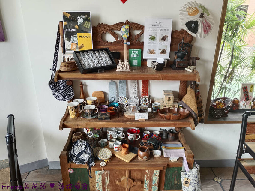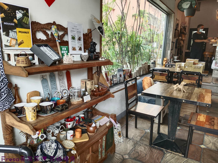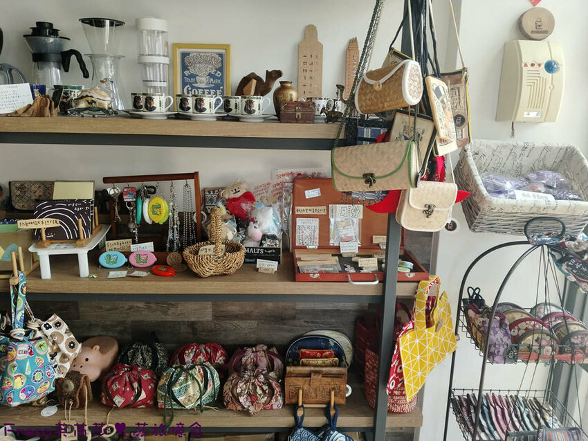 發現了沒,牆面上掛著各種包包、咖啡豆販售.
