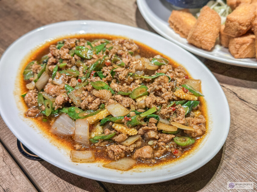 豬絞肉與洋蔥、玉米筍、四季豆一起爆炒,微酸帶辣,香氣濃郁,超級下飯!