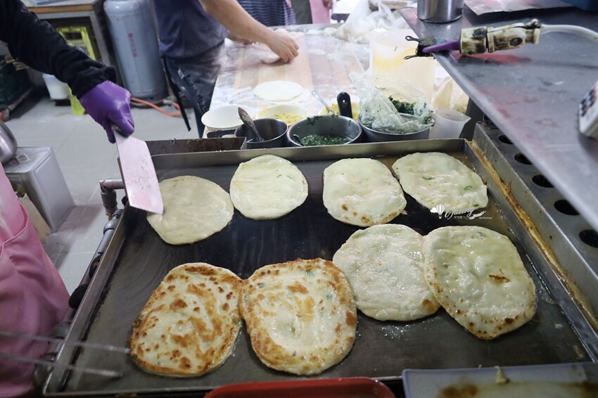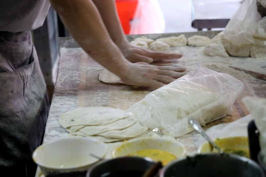 他們的招牌蛋餅現點現橄現煎,手作檯上的麵糰始終不停地揉捏著。