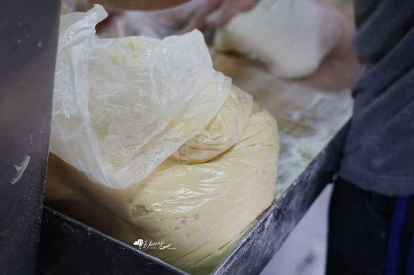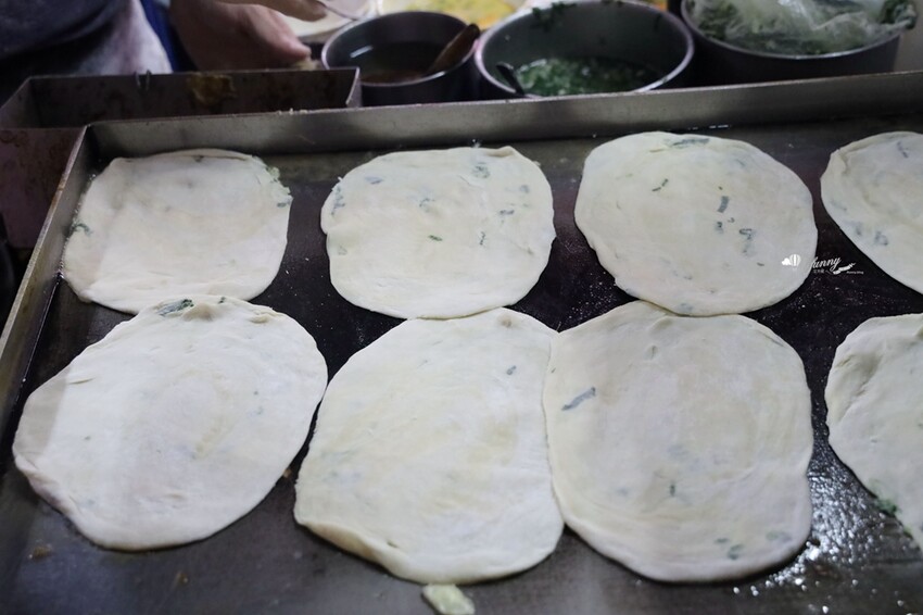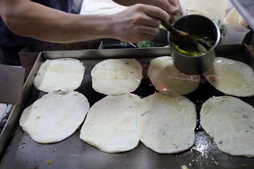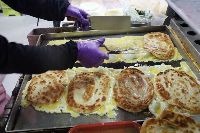 當天我觀察到,麵糰裡還揉入了酥油,這便是讓蛋餅特別酥脆的祕訣。