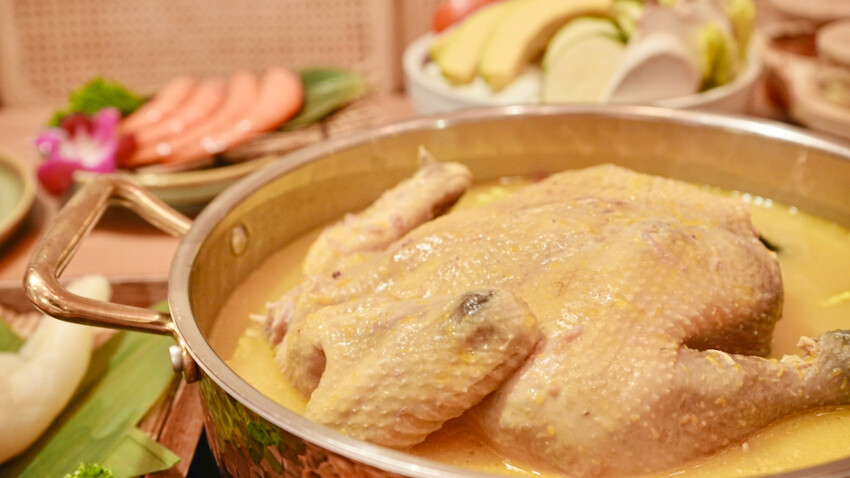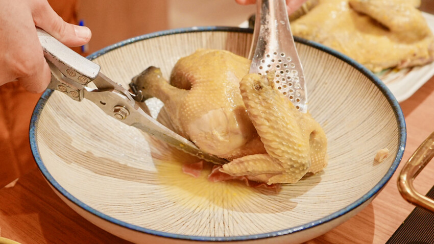 一大鍋的雞湯份量十足,在滾沸的煙霧中,霸氣醇厚的香氣好誘人,超貼心的桌邊服務,幫忙處理全雞,一半會再入鍋熬煮來提升食物的美味層次,另一半會直接切盤上桌喔!