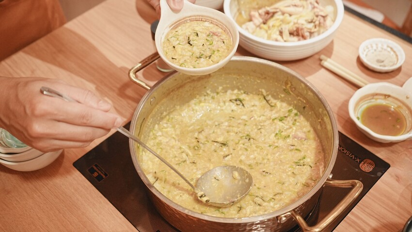 用餐完畢後,鍋底會有專人協助煮粥,享受完尊寵味覺的火鍋體驗,鍋底的精華可不能浪費,有了各式食材的風味加持,加入雞蛋、蔥花、海苔,超濃郁的花膠雞湯粥太好吃了吧!