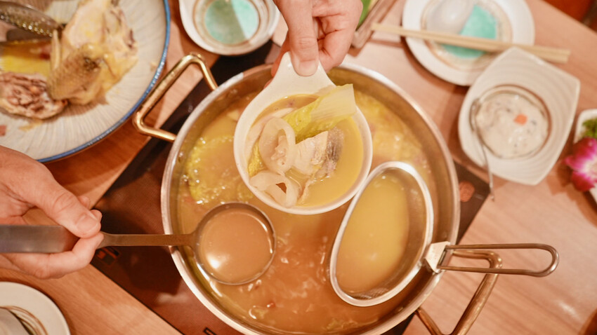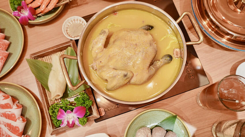 梁湯火鍋 港式煲湯鍋物必點招牌「黃金花膠雞湯」,人多推薦加點全雞,全雞需要兩天前預約,訂位時記得要先預約喔!