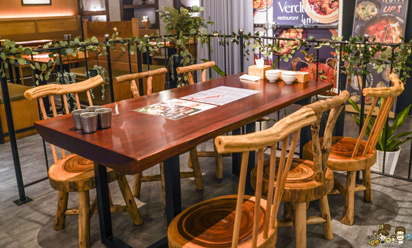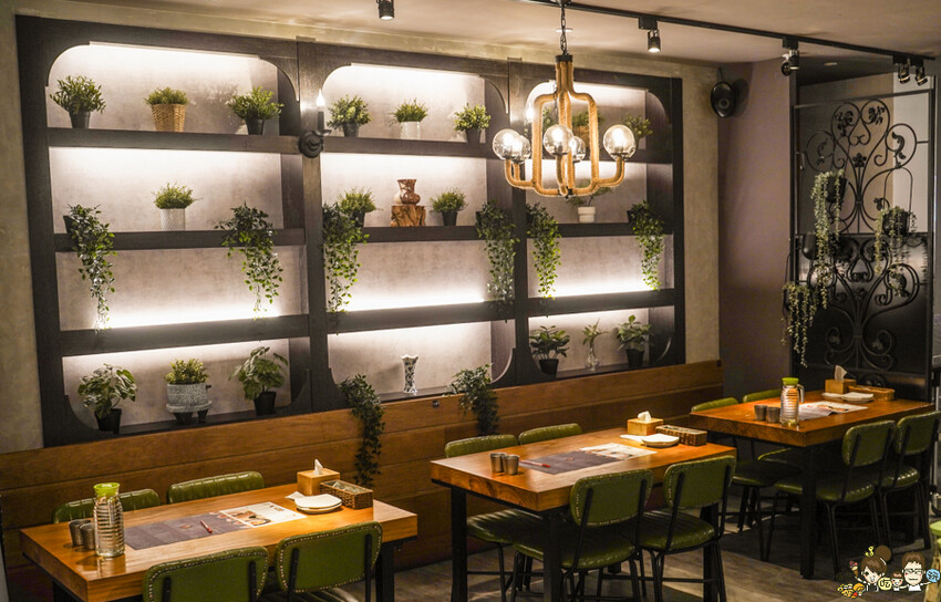 帶有木質森林系的用餐環境,柔和黃色光會讓心情更加穩定