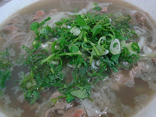 說穿了就是越南版的陽春麵,它的湯很清,嚐起來的味道很香,有點類似清燉牛肉湯,上面撒滿蔥花、香菜(不想吃肉的朋友可以點囉)