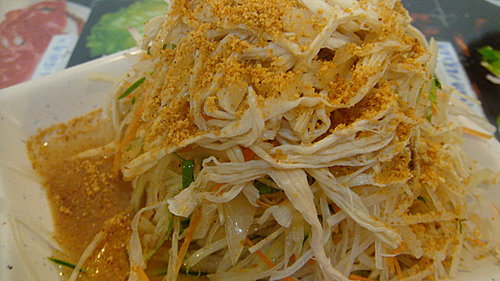 說真的這是我最愛的一道菜,非常清爽~裡頭有黃瓜絲、青木瓜絲、紅蘿蔔絲...等~灑上花生粉,淋上酸甜醬汁,真的很消暑開胃哦~(而且它刨絲刨得很細,口感絕妙,是泰式青木瓜沙拉的一半粗細而已)