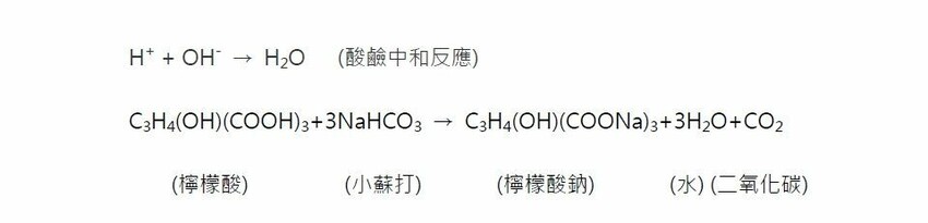 不使用鋼瓶到底要如何起泡呢?!大家還記得以前上化學課常見的化學反應嗎!?運用酸鹼中和的原理,只要將檸檬酸與碳酸氫鈉混和在水中發生放熱反應後,就會產生大量的CO2(化學式如下圖,圖片來源:Google)