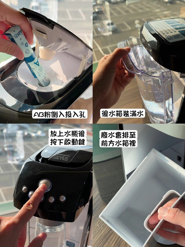 也就是說只要把A(檸檬酸11g)+B(碳酸氫鈉13g)倒入投入口,將機台後面的水箱裝滿水後,按下製作鍵,氣泡粉與水就會在機台內混合產生出CO2,而與水溶解後的廢水,就會排到前面的水箱盒(約5次滿水)