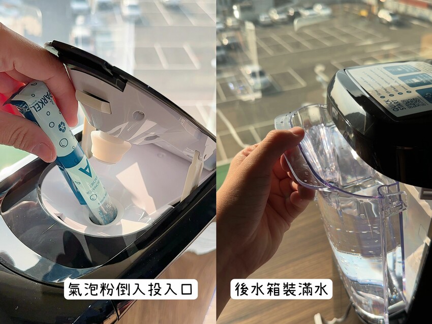 在使用上要注意,不用對機台太過於溫柔,下壓提拔時,建議用力一次壓到底,才不會無法打氣,下壓提拔後,就不能再開啟氣泡粉投入口,所以一開始就要先加好,整個操作我覺得非常直覺簡單,簡單按個按鈕,就可以輕鬆打氣,超方便!