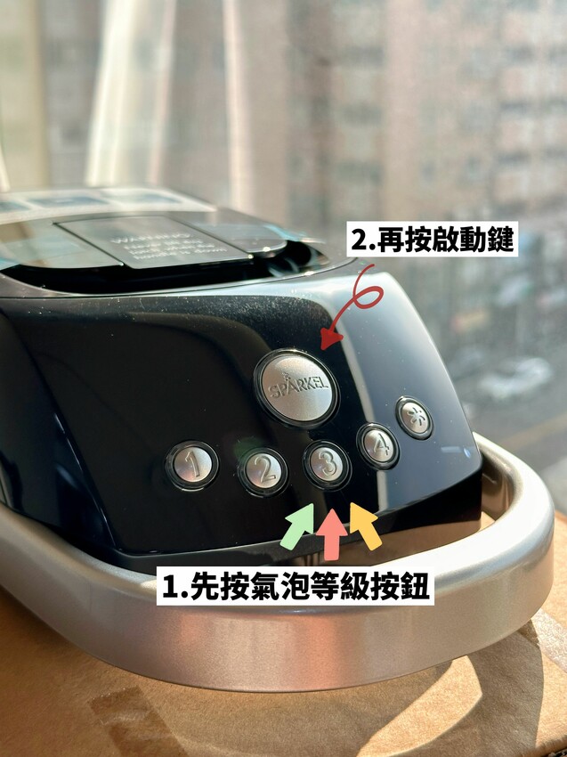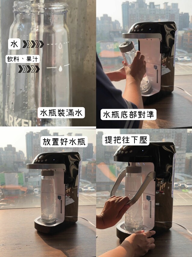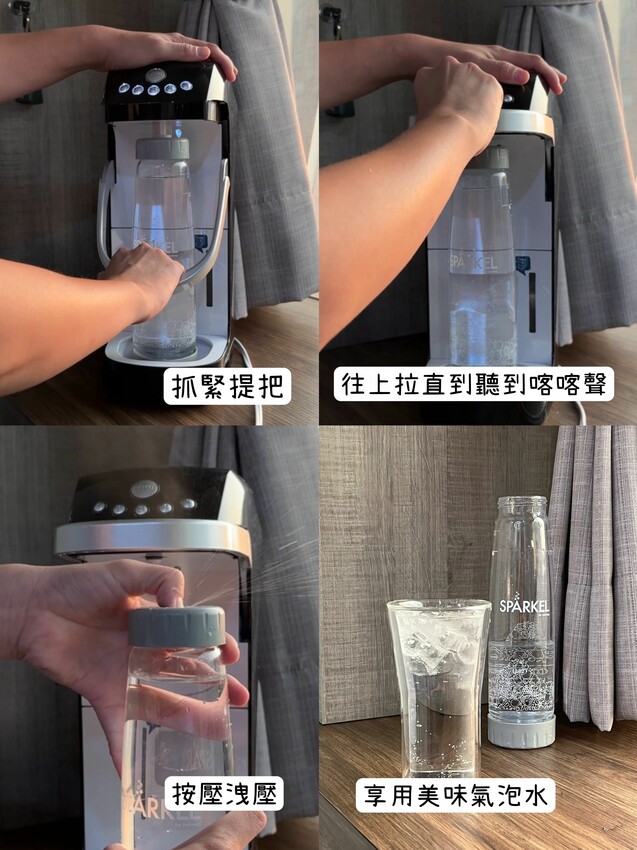 打氣完後,上拉提拔直到聽到喀喀聲,取出水瓶後,大拇指按壓洩氣閥洩氣後,就可以享用美味氣泡水啦!