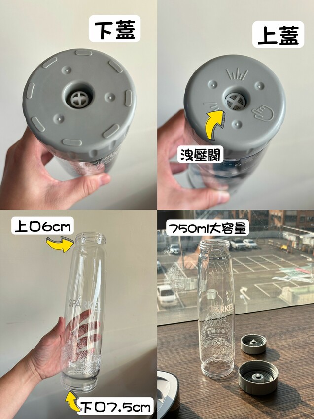 Spärkel氣泡水機搭配Tritanᵀᴹ無毒水瓶,上下蓋皆可拆,不含雙酚A,耐摔、耐高溫,還可放入洗碗機清洗,真的超方便!