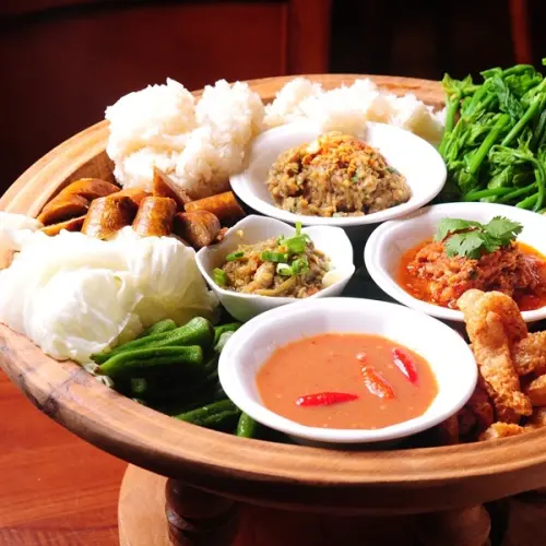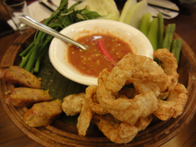 這是道溫的沙拉~裡頭有炸豬皮~泰北香腸~清燙過的菜豆、龍鬚菜、絲瓜、瓠瓜、高麗菜和糯米,徒手拿取沾番茄肉醬就是最正統的吃法