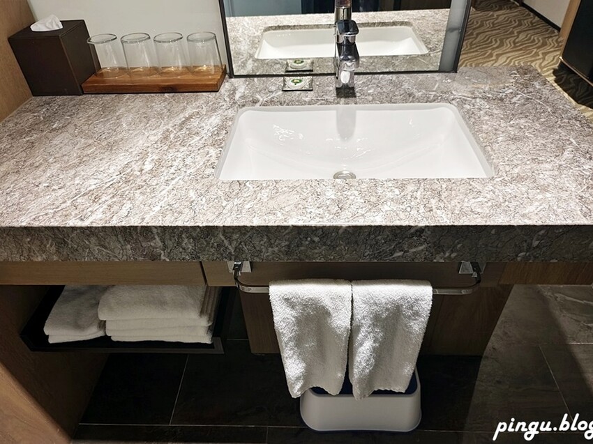 洗手台下方有浴巾,更貼心的備有小朋友的腳踏椅,若不夠高可以踏上腳踏椅洗手,抽屜內有吹風機及盥洗用具,9/1起酒店就不主動提供一次性盥洗用具囉~大家要記得自己帶唷~~