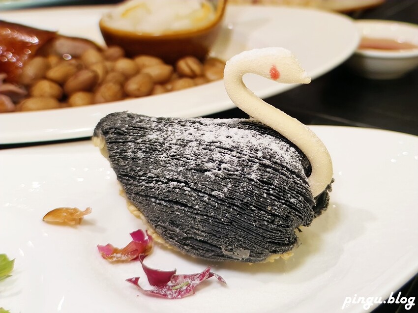 鴛鴦天鵝酥以其精緻的造型和獨特的口感著稱,一上桌就吸引的眾人的眼光,鴛鴦天鵝酥造型精巧,外層的酥皮金黃酥脆,黑色是以竹炭調製而成,內餡分為甜鹹兩種口味,甜的是豆沙鹹的是叉燒餡,真的是一場視覺與味覺的饗宴啊!!