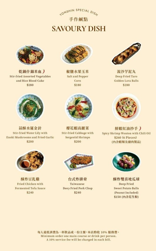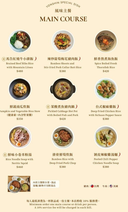 菜單提供風味主餐、手做鹹點、台灣茗茶、特調飲品,精選甜點也很有台灣味哦,另外這裏的千層聽說也很有名。其中菜色大部份都是經典台菜居多,剝皮辣椒雞湯、牛肉飯、米粉湯、乾拌麵等