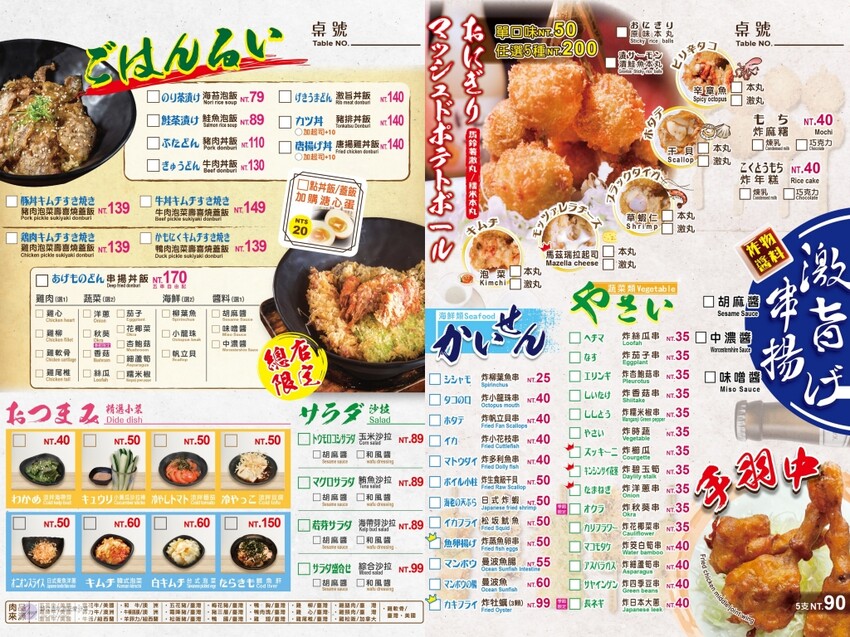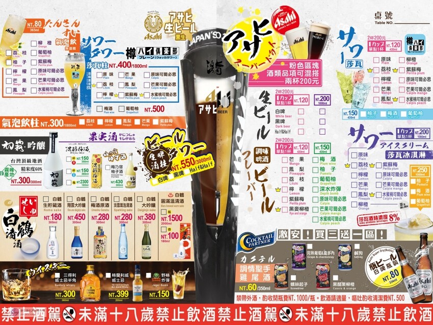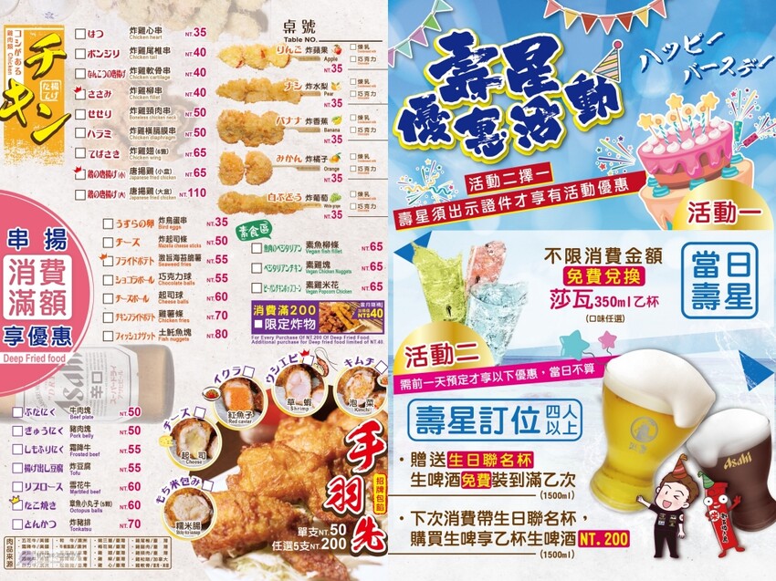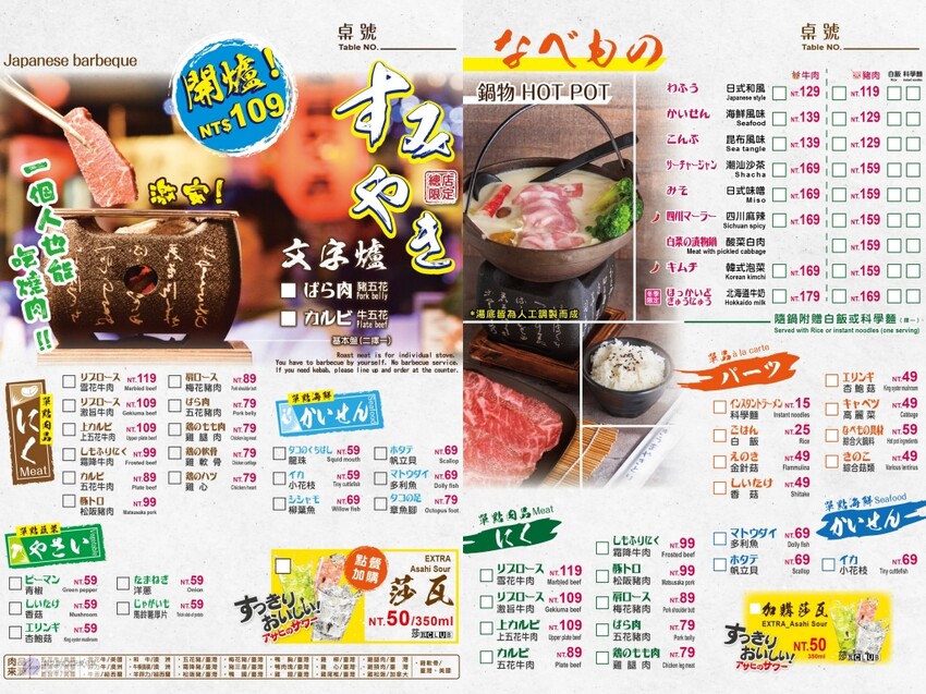菜單選擇多元,涵蓋燒烤、炸物、鍋物、丼飯、酒類等,價格範圍從$25到$550不等。露天區無低消限制,室內冷氣區則需低消及服務費,且無用餐時間限制,讓你可以和朋友自在暢聊一整晚。