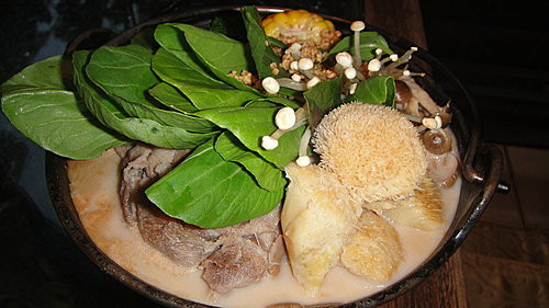 及大骨高湯調勻,放入滿滿的火鍋料,還有每斤要價450元的猴頭菇,