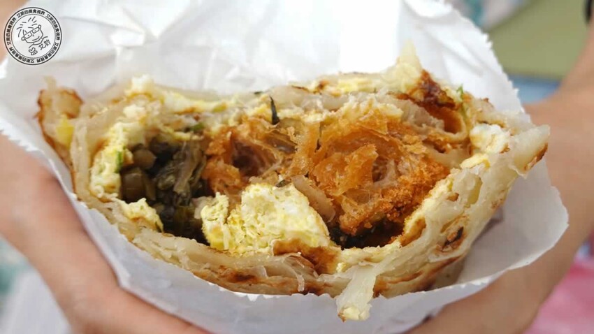 他們家的飯糰特別之處就是用半張蔥油餅去包,