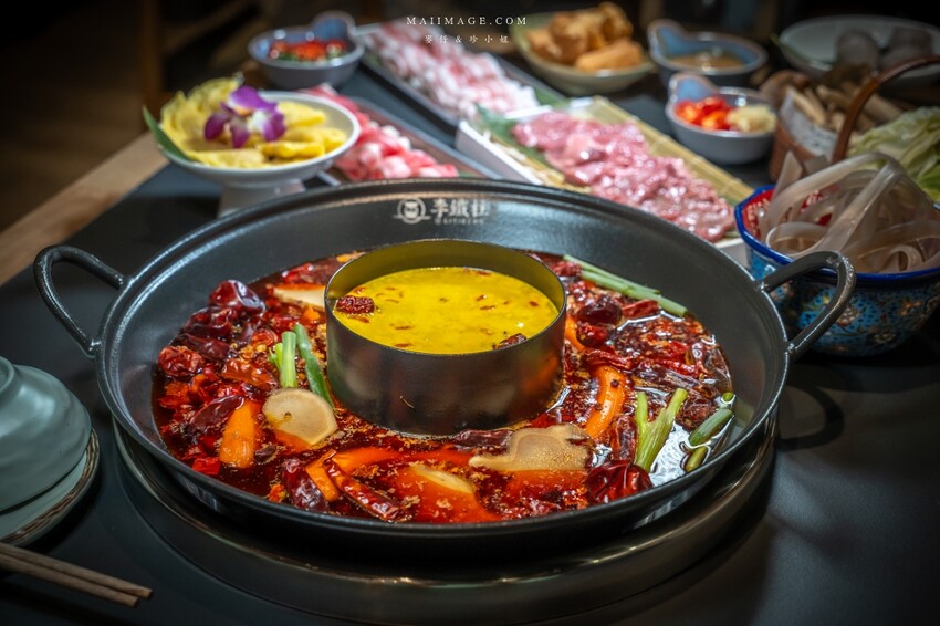 《李鐵柱火鍋村》的服務人員都換上了專屬制服很有儀式感,還有這很有記憶點的鴛鴦鍋,這鍋子是老闆直接訂製的,外面可是找不到這樣的鍋。