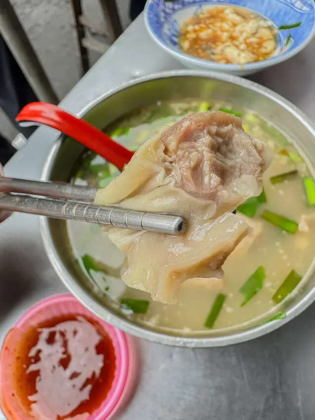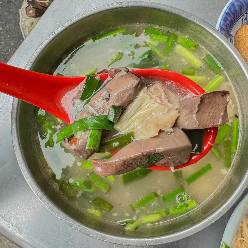 大腸豬血湯因為燉了很多內臟,濃郁到像拉麵湯頭了,點份綜合可以吃到所有食材,內含豬皮、剁碎豬腳大骨、肝連肉、大腸、小腸、菜頭、油豆腐、韭菜、蒜酥、豬血、玉米等,湯頭濃郁。