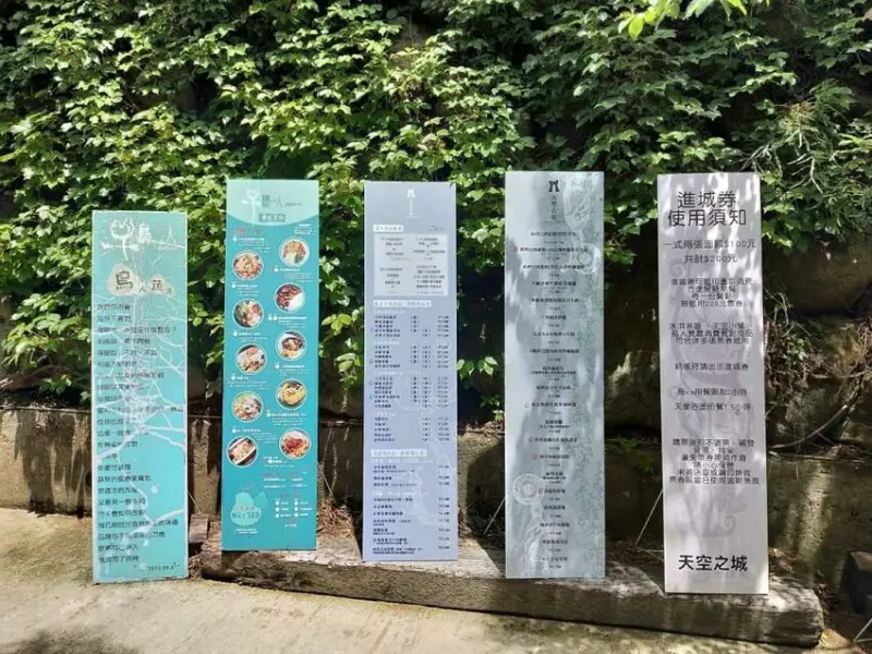 進入園區後,會看到門口擺放著一些牌子。在這裡會列著天空之城的,有一點必須注意的是天空之城內的餐廳有限定用餐時間,想來享受美食的話請繼續往下看詳細說明喔。