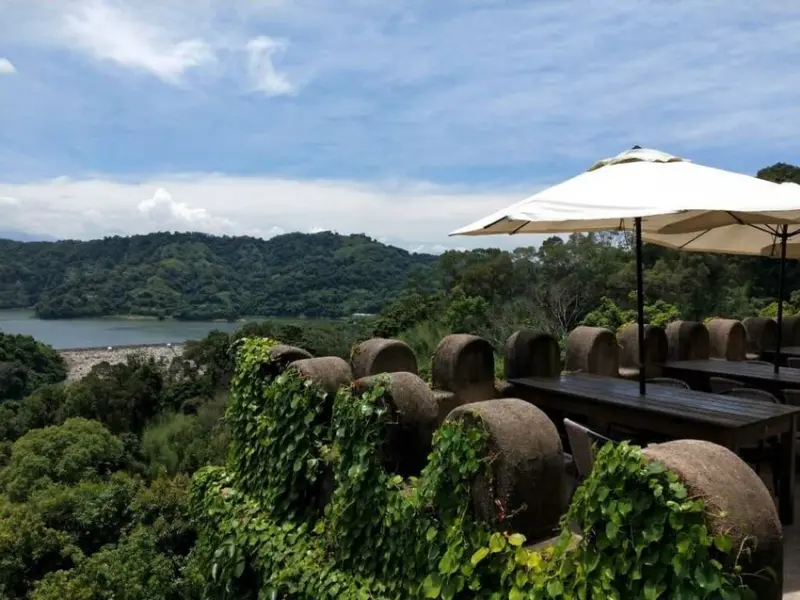 ▼天堂古堡的室外座位,坐在這個位置用餐,可以遠眺鯉魚潭水庫喔