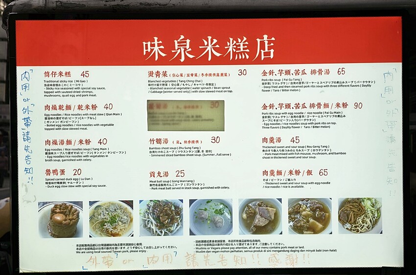 味泉米糕菜單,以米糕、排骨湯、肉羹系列為主!!店內附東泉辣椒醬、特製辣醬,有吃辣的朋友不要錯過了。不管內用外帶都是先付款、再拿取餐點喔!