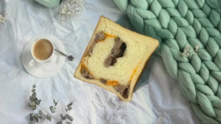 切開有驚喜,軟綿的吐司包著經典大甲芋頭餡及紅土醃製鹹蛋黃,真的是有顏值有內涵的吐司麵包!
