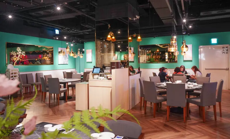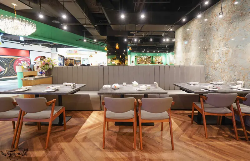 餐廳以蒂芬妮綠為主要色調,選用仿大理石桌面,座位採用沙發或舒適的座墊椅,帶長輩來用餐久坐也舒服。