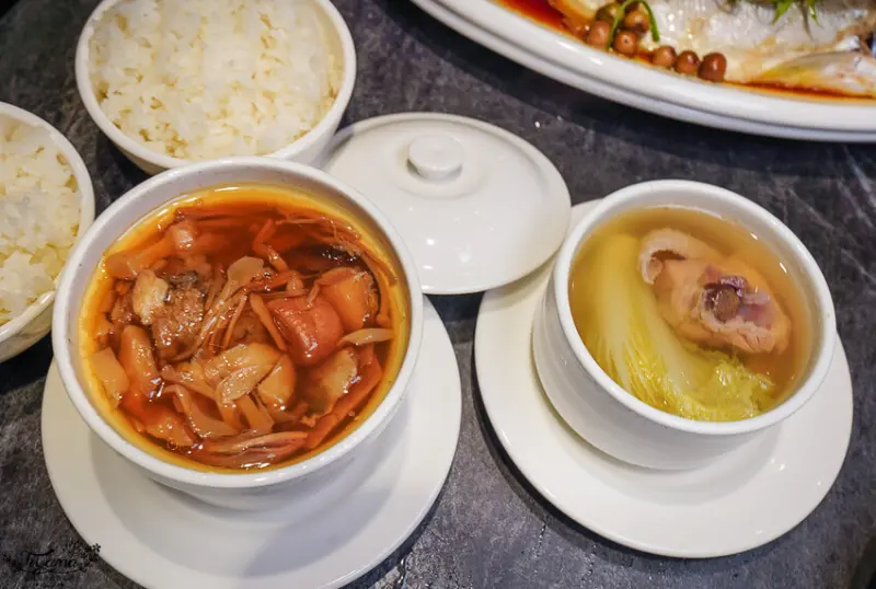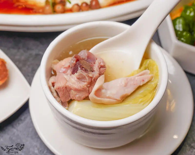 湯品皆是以單人一盎供餐,干貝豬肚雞的湯頭高雅清甜,雞腿肉、豬肚、娃娃菜燉至軟、嫩、香,是大眾都會喜歡的湯品。