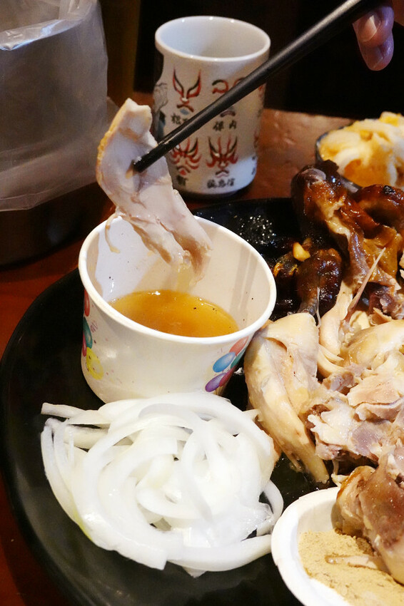 熱騰騰的雞肉吃起來很軟嫩多汁、香氣四溢,每一口都讓人欲罷不能。雞肉沾帶有淡淡甜味的雞汁口感更滑潤,把桶仔雞沾胡椒鹽或配生洋蔥吃,也能享受不同的風味口感。